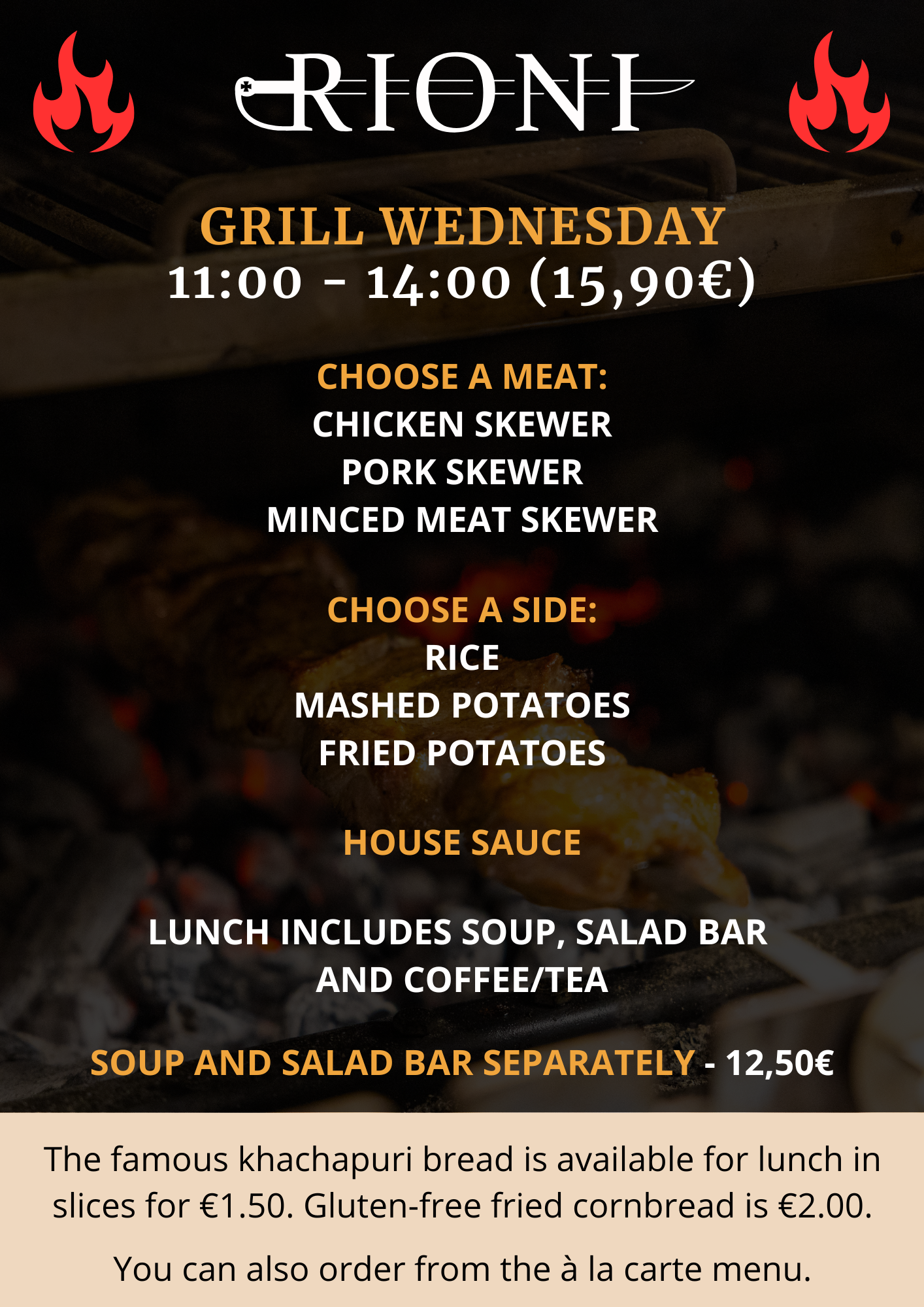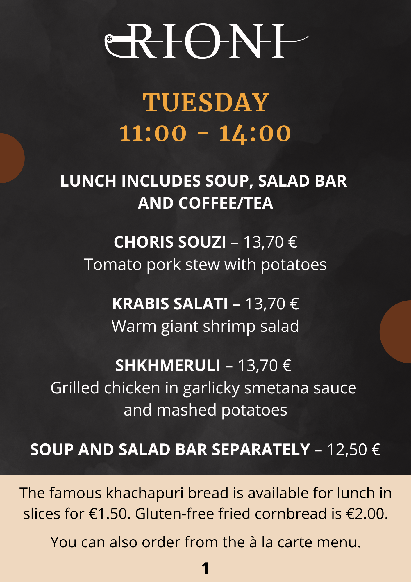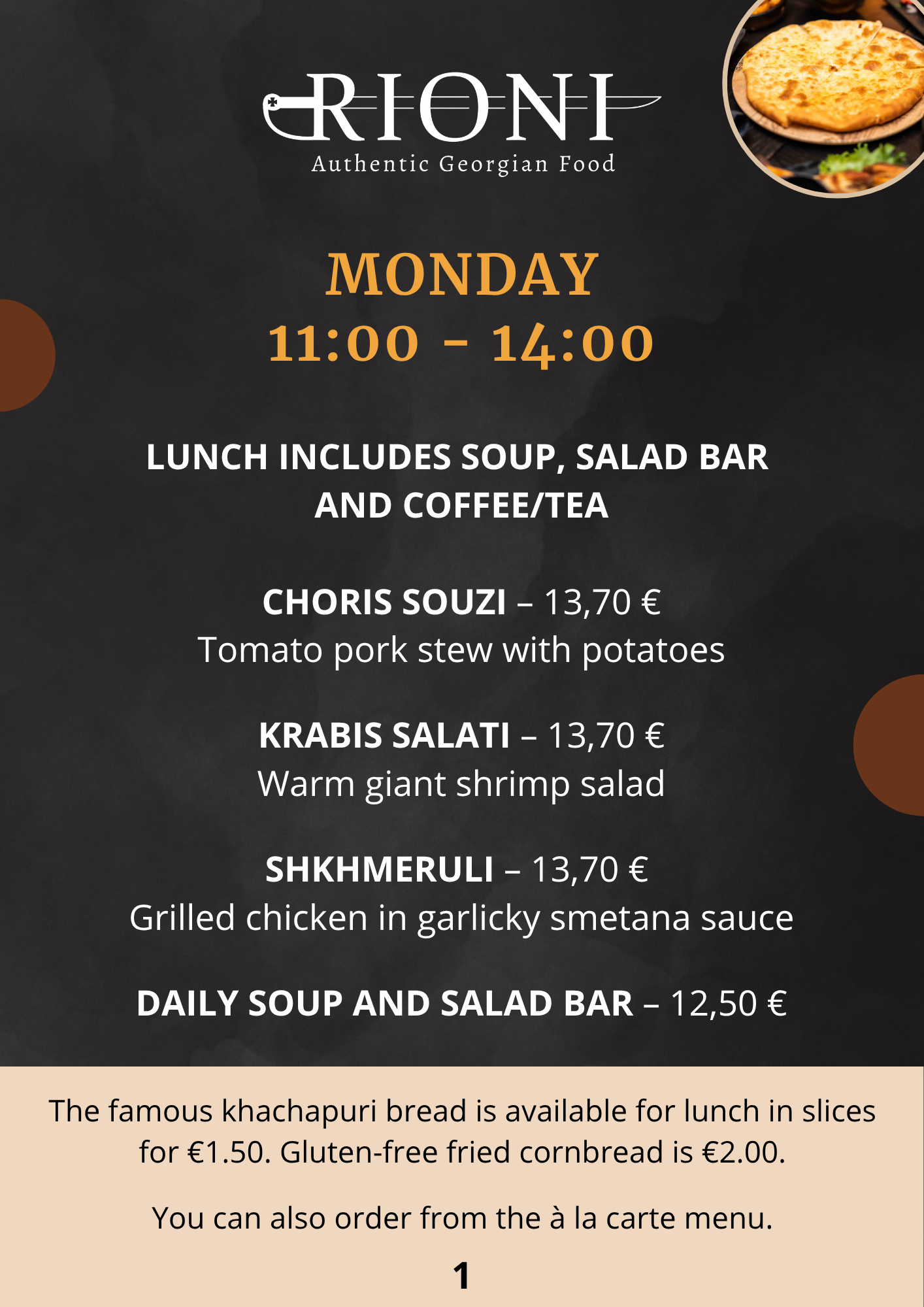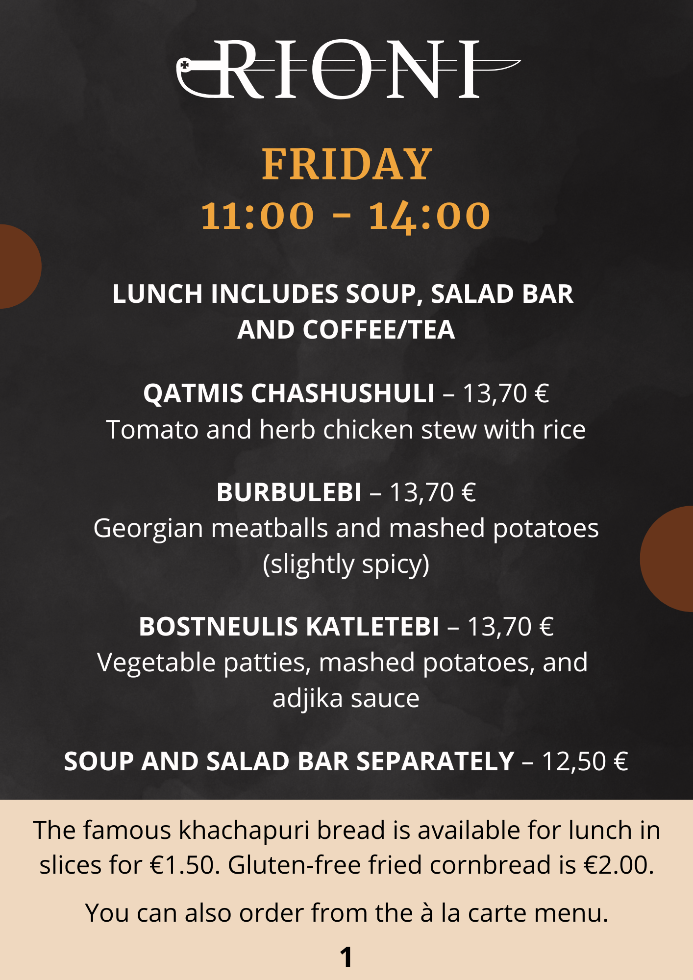 Would you like a delicious Georgian lunch? Restaurant Rioni offers the best flavours of Georgian cuisine. We prepare mouth-watering meat stews as well as various vegetable options. For a gluten-free dish, we bake cornbread (with or without cheese) for €2.00. Our famous khachapuri bread is also available by the slice for €1.50.